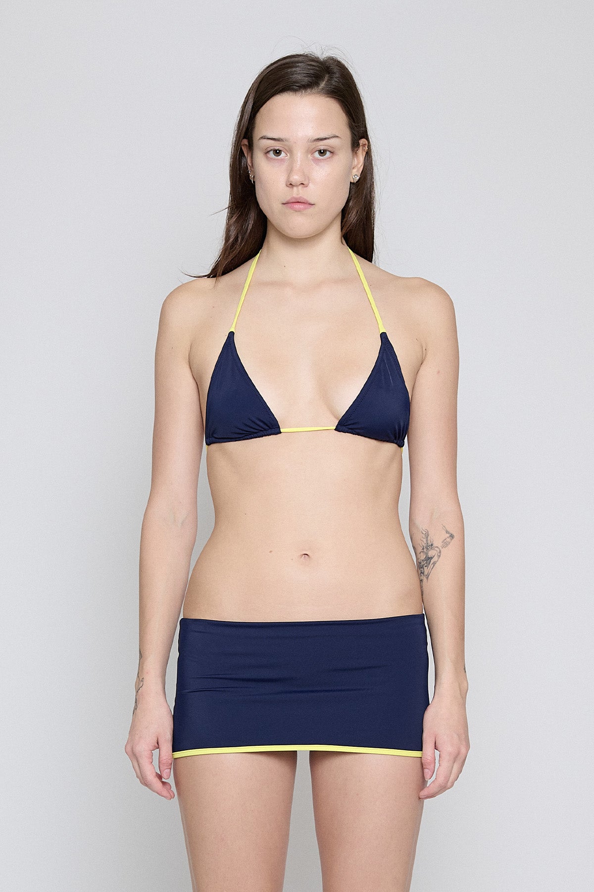 Designed with a classic triangle silhouette, PRISCAVera’s signature bikini top returns in navy for the season. Featuring halter and back tie-straps for an adjustable fit, the style is finished with contrast straps that frames the clean, minimal shape.