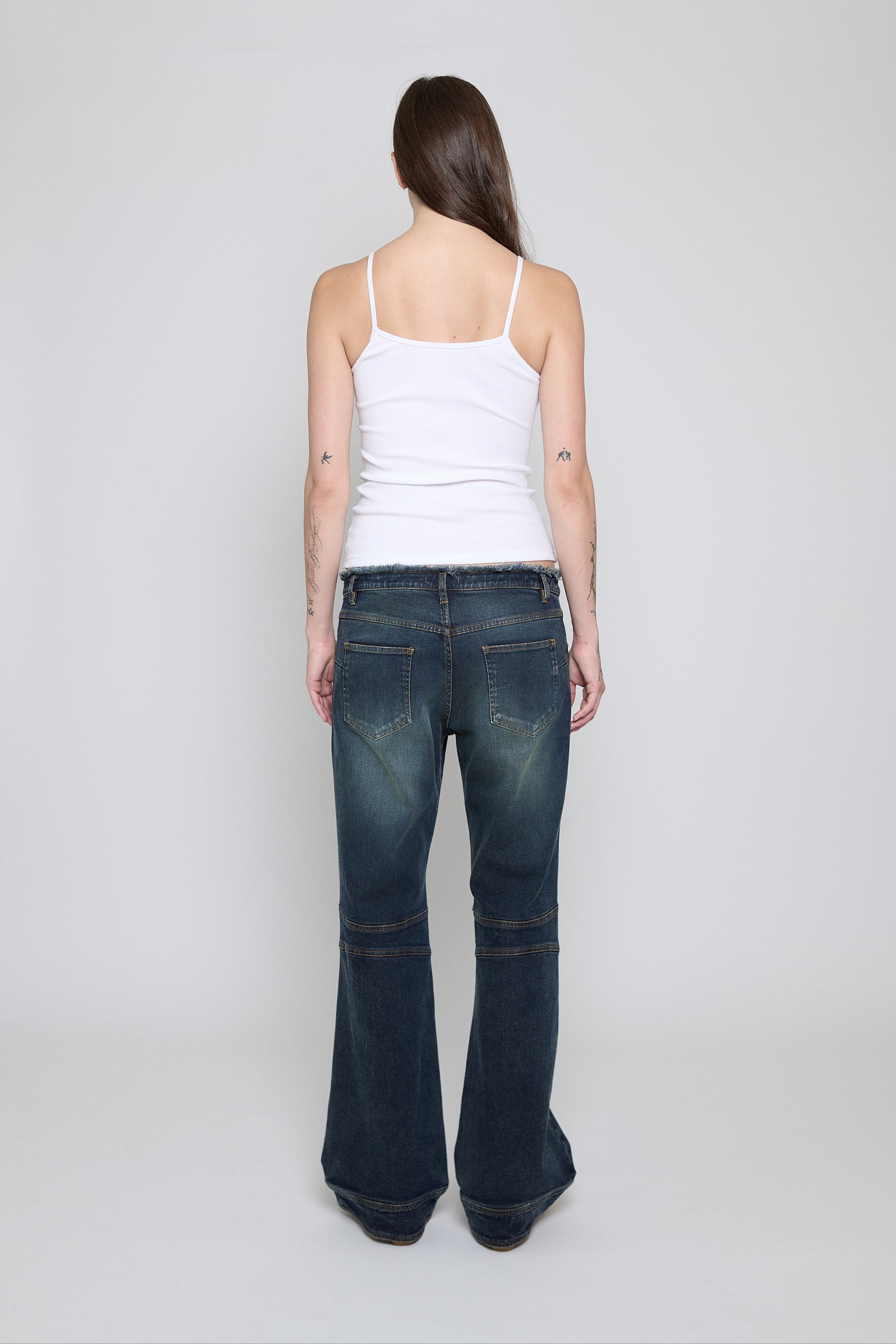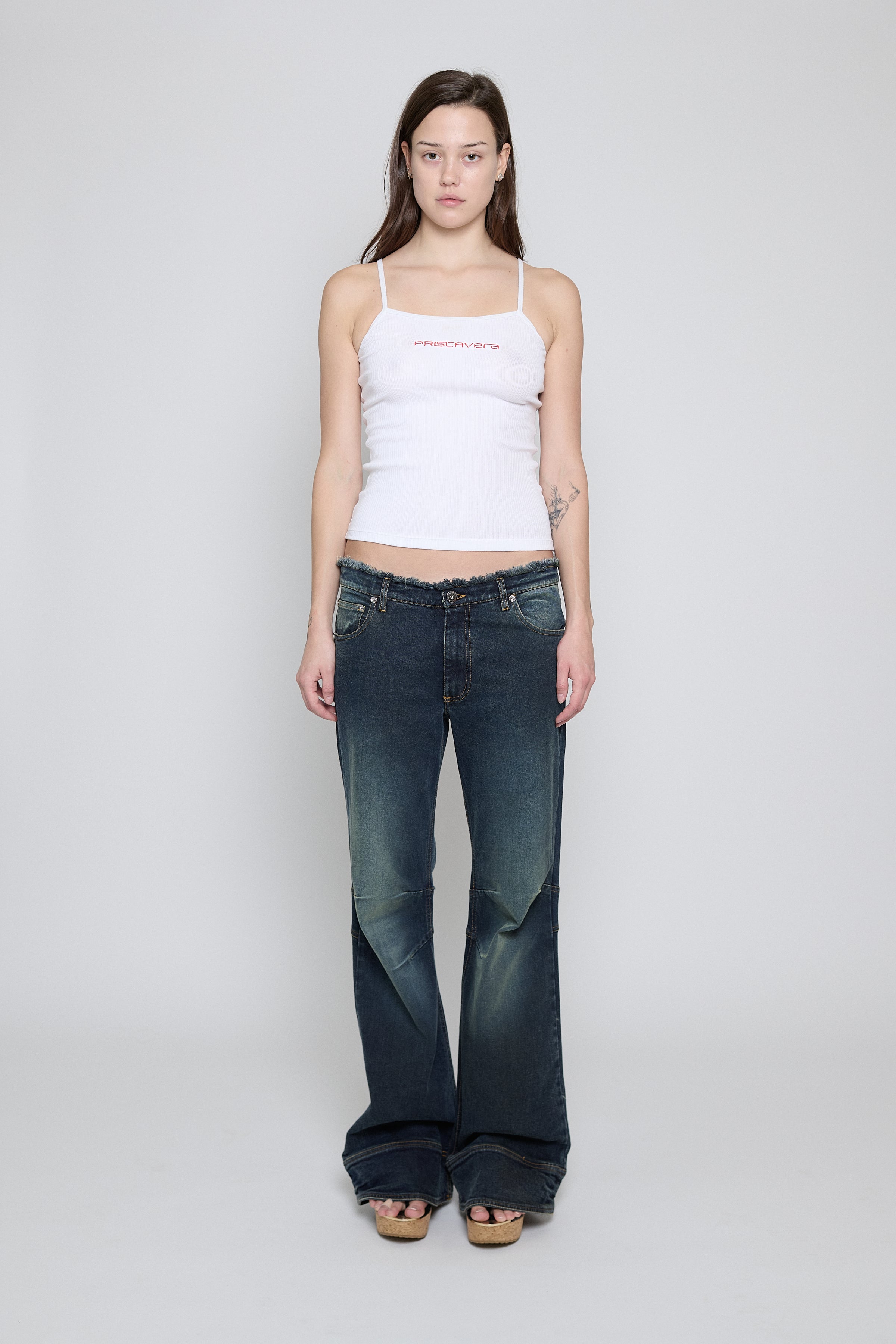 Cut in acid green denim, these low-rise jeans feature a frayed waistband and a relaxed, flared leg with a curved cuff. Darting at the knees adds subtle shape and movement, balancing structure with ease.