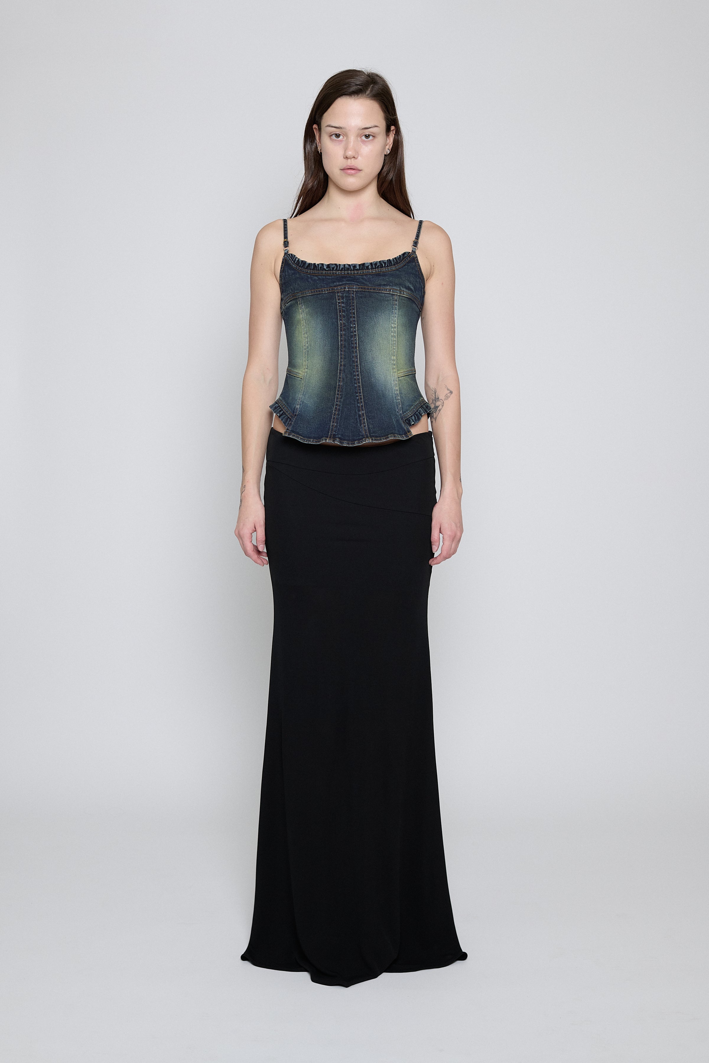PRISCAVera’s seasonal skirt is cut from black Italian-made stretch viscose jersey. This sleek maxi silhouette features a V-shaped back opening that laces up with a tonal leather cord, creating an adjustable fit and subtle reveal.