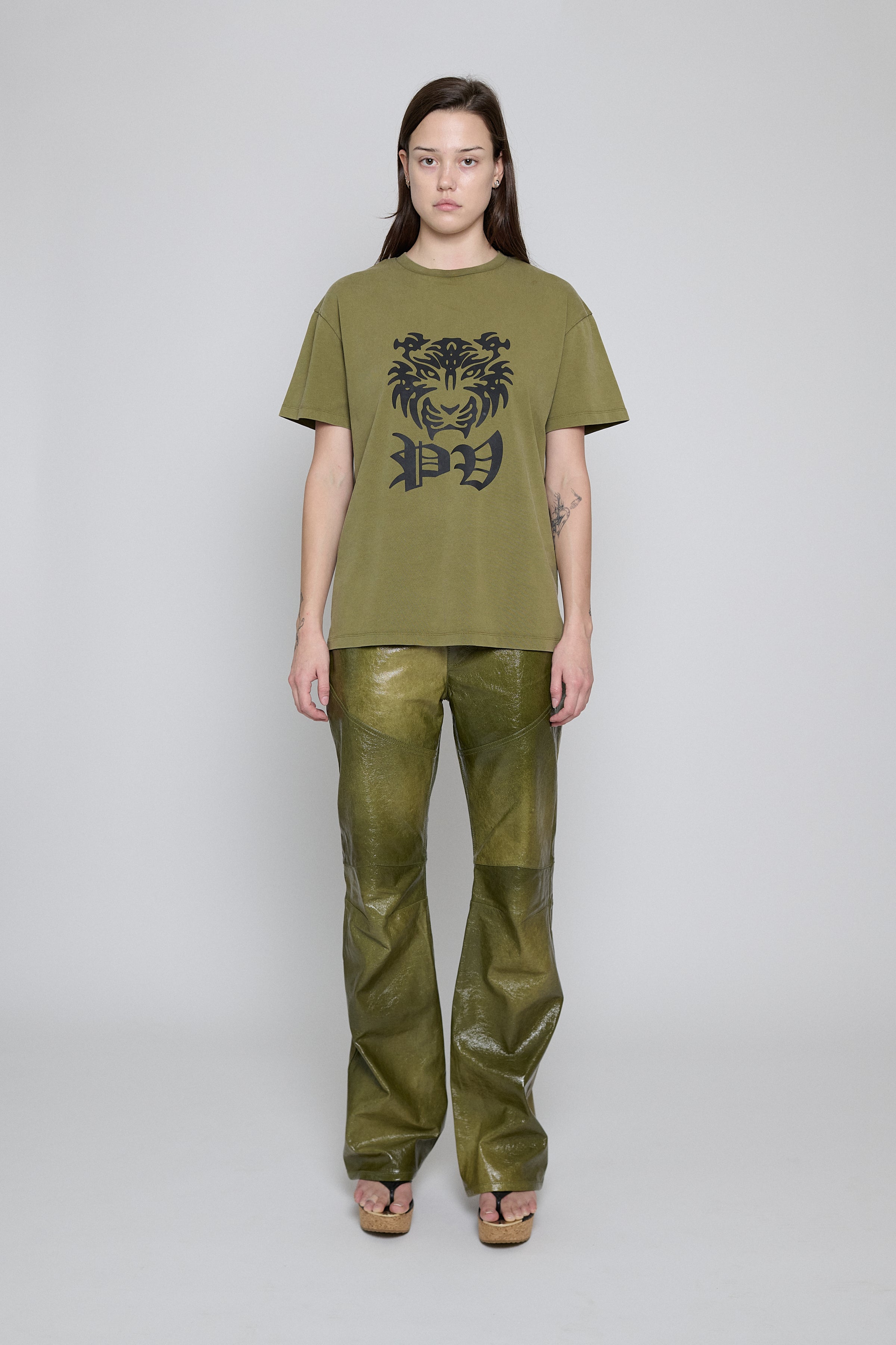 Cut from washed cotton jersey in an olive hue, this short-sleeve tee features a relaxed, straight silhouette. Finished with a seasonal SS26 PV Tiger graphic at the front, executed in a raised puff print for added texture.